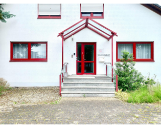 Der Zugang erfolgt über den Haupteingang mit einer vierstufigen Treppe; ein barrierefreier Zugang kann bei Bedarf nachträglich angebaut werden. Fünf Stellplätze direkt vor dem Eingang bieten komfortables Parken für Mitarbeitende und Besucher.