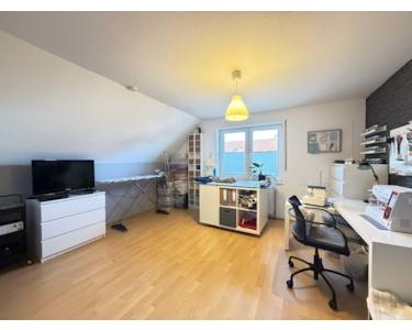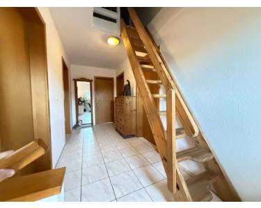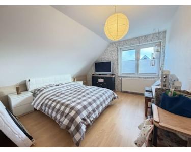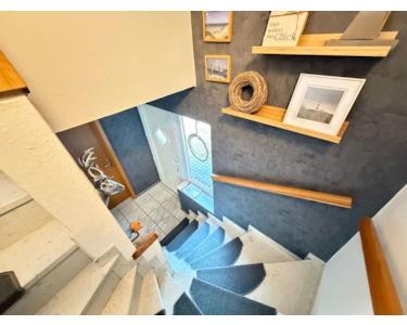 Über die formschöne geflieste Betonkerntreppe, mit fußwarmen Stufenmatten, gelangen Sie ins Obergeschoss, wo sich drei weitere Schlafzimmer befinden. Der Spitzboden wurde zusätzlich als Gästezimmer ausgebaut – ein gemütlicher Ort, der zusätzlichen Raum für Familie, Freunde oder Hobby bietet.
