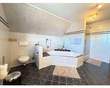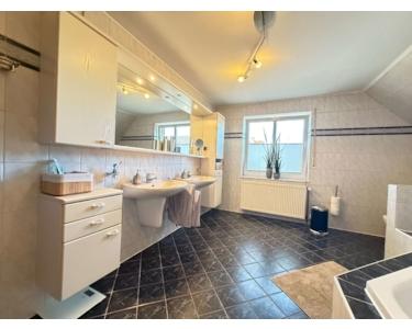 Das große Badezimmer überzeugt durch seine klassisch-elegante Gestaltung mit schwarzen und weißen Boden- und Wandfliesen. Badewanne, separate Dusche, moderne weiße Badmöbel und ein wandhängendes WC schaffen eine zeitlose und gepflegte Wohlfühlatmosphäre.