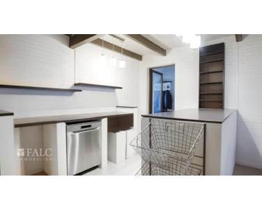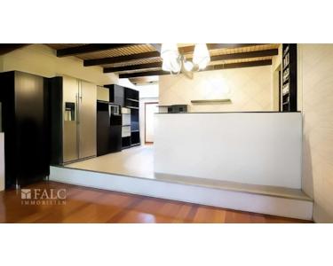 Die Küche, aufgeteilt in zwei Ebenen, ist sowohl funktional als auch stilvoll gestaltet. Der obere Bereich bietet ausreichend Platz für kulinarische Experimente, während der Sitzbereich im unteren Teil ideal für gemütliche Mahlzeiten ist.