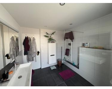 - Modernes Badezimmer mit weißer Sanitärausstattung, raumhohen Fliesen, begehbarer Dusche, Waschbecken, WC und Spiegelwandschrank