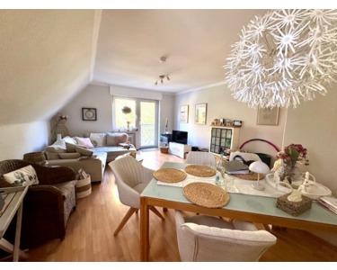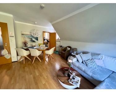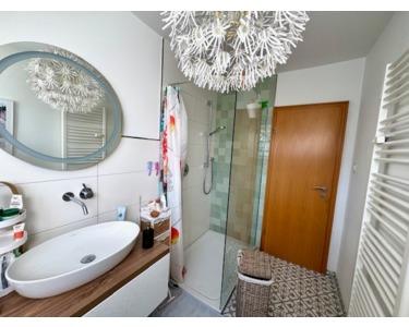 Eine massive Steintreppe führt in das Obergeschoss. Diese Etage verfügt über eine Wohnfläche von 75 m² zuzügl. Balkon. Hier gibt es eine Diele, drei schöne Schlafräume (ein Raum neben dem Wohnzimmer verfügt über ein bodentiefes Fenster und ermöglicht einen Zugang zum Balkon), ein vor 5 Jahren erneuertes Badezimmer mit ebenerdiger Glasdusche, Handtuchwärmer, Waschtisch und WC, eine Küche mit Zugang von der Diele und nochmal zum toll aufgeteilten und hellen Wohn- Essbereich - ebenfalls mit Zugang zum Balkon. Eine feuerverzinkte Wendeltreppe führt von dieser Wohnung in den Garten.