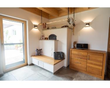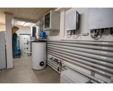 Eine leistungsstarke Luft-Wasser-Wärmepumpe, ein wassergeführter Kachelofen zur Heizungsunterstützung sowie eine Photovoltaikanlage mit Batteriespeicher verspricht eine zukunftssichere und nachhaltige Energieversorgung.