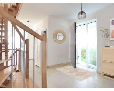 Beim Betreten des Hauses empfängt Sie ein einladender Eingangsbereich, der mit hellen Fliesen und einer modernen Treppe ausgestattet ist. Von hier aus gelangen Sie direkt in den großzügigen Wohn- und Essbereich, der durch große Fensterfronten viel Tageslicht bietet. Der Raum ist offen gestaltet und bietet ausreichend Platz für gemütliche Abende mit der Familie.