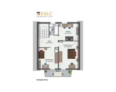 Im Dachgeschoss befinden sich drei Schlafzimmer (ca. 9,7–15,4 m²), ein Badezimmer sowie eine Diele mit Zugang zum Balkon (ca. 5 m²).
