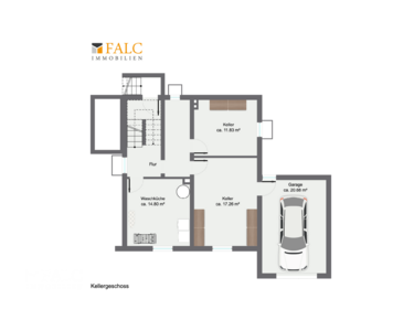 Im Kellergeschoss stehen drei Kellerräume, eine Waschküche und der direkte Zugang zur Garage zur Verfügung.
