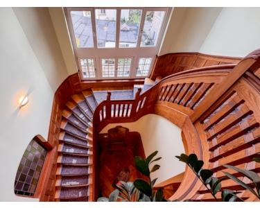 Der edle Parkettboden und die denkmalgerecht aufgearbeiteten Holzfenster unterstreichen das stilvolle Ambiente. Moderne technische Ausstattung fügt sich harmonisch in die historische Bausubstanz ein: Glasfaseranschluss, Bodentanks, ein klimatisierter Serverraum sowie eine Alarmanlage und das Fibaro Smarthome System.