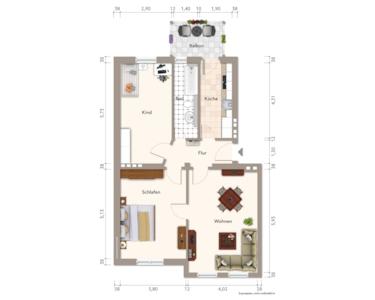 Die Wohnung verfügt über zwei gemütliche Schlafzimmer, ein großzügiges Wohnzimmer sowie eine separate Küche mit Zugang zum Balkon – ideal für entspannte Stunden im Freien. Das Tageslichtbad ist mit einer Badewanne ausgestattet und sorgt für eine angenehme Wohlfühlatmosphäre.