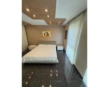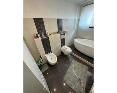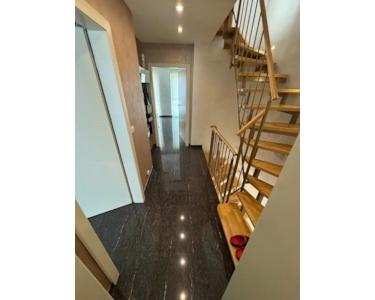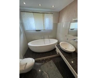 Im Obergeschoss befindet sich auf der rechten Seite das großzügig geschnittene Elternschlafzimmer. Direkt daneben liegt ein weiteres, etwas kleineres Schlafzimmer, das sich ideal als Kinderzimmer eignet. Anschließend folgt das modern ausgestattete Badezimmer mit freistehender Badewanne, Bidet, WC und einem Hygienebereich.