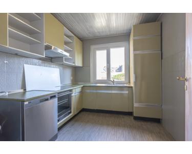 Die Küche misst ca. 8 m² und verfügt über eine L-förmige Küchenzeile mit folgender Ausstattung: Elektroherd, Dunstabzug, Geschirrspüler, Backofen und Kühlschrank.