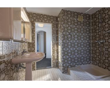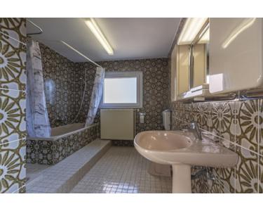 Das komplett geflieste Badezimmer ist ca. 8 m² groß und ausgestattet mit Badewanne, Dusche, Waschbecken und WC.