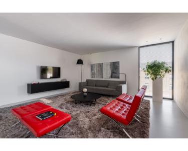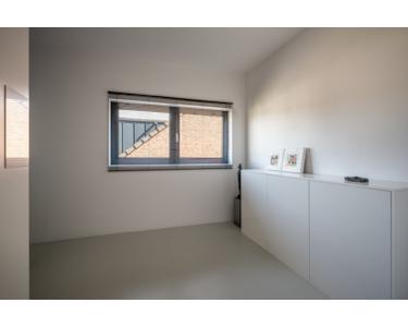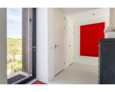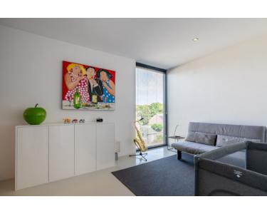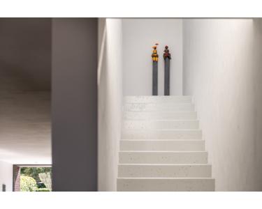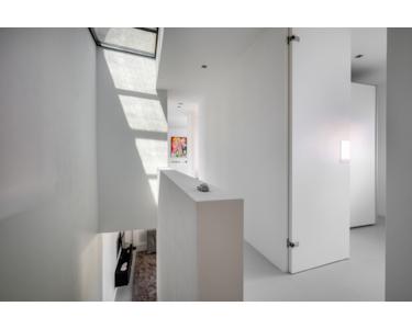 Über eine feste Betontreppe im Wohnzimmer gelangt man ins Obergeschoss. Der Flur ist durch eine große Lichtöffnung mit elektrisch steuerbarem Sonnenschutz, der über ein Smart-Home-System gesteuert wird, lichtdurchflutet. Diese Etage beherbergt drei Schlafzimmer mit ca. 25 m², 16 m² und 10 m² Fläche.