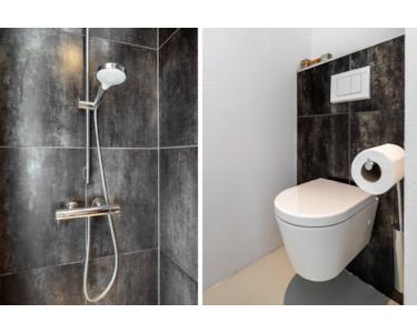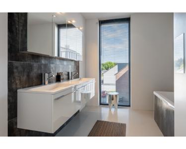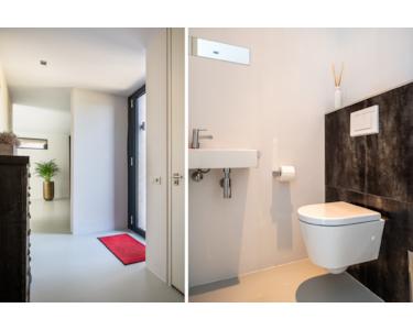 Im luxuriösen Badezimmer finden sich ein Doppelwaschbecken mit Unterschrank, eine Badewanne, eine ebenerdige Dusche, eine Toilette und ein Design-Heizkörper. Außerdem befindet sich hier der Technikraum mit einer neuen Nefit-Gastherme aus dem Jahr 2024, einem System zur Wärmerückgewinnung sowie der Steuerung für die Solaranlage.