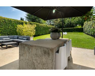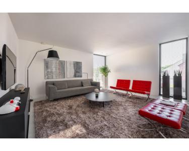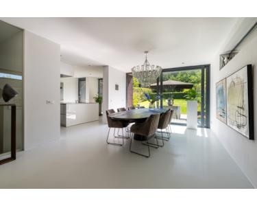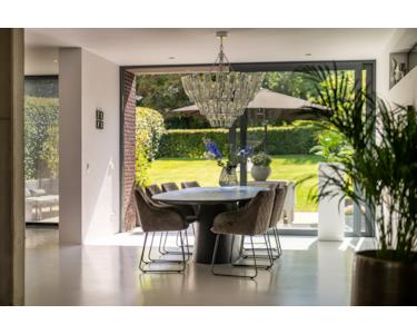 Das Wohnzimmer ist offen und geräumig gestaltet. Ein stilvoller Raumteiler mit Gaskamin trennt den Raum elegant und schafft eine behagliche Sitzecke. Angrenzend befindet sich das Esszimmer, das mit der Küche verbunden ist. Hier findet auch ein großer Esstisch bequem Platz und durch die große Schiebetür gelangt man direkt in den Garten.
