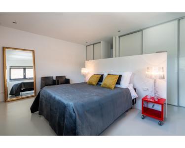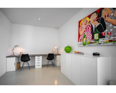 Auch diese Etage präsentiert sich mit einem hochwertigen Epoxidboden, Fußbodenheizung, eleganten Einbauleuchten und architektonisch außergewöhnlichen Innentüren, die sich beidseitig öffnen lassen.