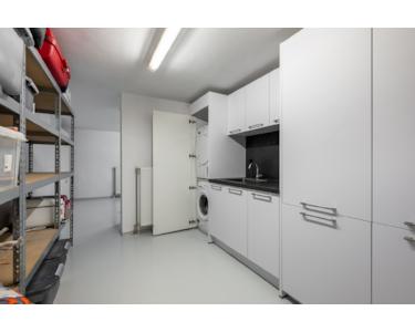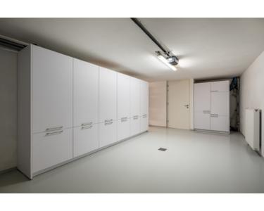 Die Zufahrt zum Haus ist großzügig gestaltet und bietet Platz für drei Fahrzeuge. Die integrierte Garage ist sowohl über ein elektrisches Sektionaltor von außen als auch über eine Treppe vom Flur im Hausinneren erreichbar. Sie bietet Platz für ein Fahrzeug und verfügt über einen Bodenablauf, Wandschränke, eine Kühl-Gefrier-Kombination sowie ausreichend Stauraum. Zusätzlich befindet sich auf dieser Ebene ein praktischer Hauswirtschaftsraum mit Arbeitsfläche und weiteren Aufbewahrungsmöglichkeiten. Der gesamte Bereich ist mit einem langlebigen und pflegeleichten Epoxidboden versehen.