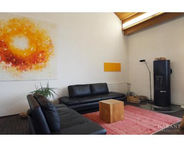 Über eine großzügige Steintreppe gelangt man bequem ins Obergeschoss, wo sich im loftartigen, großen Raum ein grandioses Wohnzimmer mit Essbereich einrichten lässt. Hier sorgt bereits ein Kaminofen für noch mehr Gemütlichkeit und die moderne Küche liegt direkt nebenan.