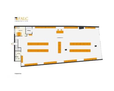 Ergänzt wird die Gewerbefläche durch einen praktischen Personalraum, der sich ideal als Büro oder Aufenthaltsraum nutzen lässt. Zusätzlich verfügt die Einheit über eine etwa 300 m² große Kellerfläche, die als Lager oder Abstellbereich genutzt werden kann. Damit umfasst die gesamte Nutzfläche des Objekts rund 672 m², bestehend aus etwa 372 m² Gewerbefläche im Erdgeschoss und rund 300 m² Lagerfläche im Untergeschoss. Diese Aufteilung bietet vielfältige Nutzungsmöglichkeiten und eine optimale Verbindung zwischen Verkaufsfläche und Lagerbereich.