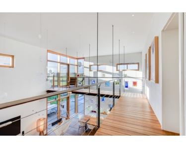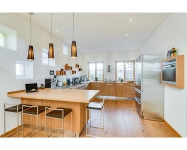 Betritt man das extravagante Wohnhaus mit seinen ca. 272 m² Wohnfläche, geben die hohen Decken, der breite Flur sowie die raumhohen Einbauschränke mit Schiebetürelementen im Eingangsbereich bereits einen Vorgeschmack auf die Weitläufigkeit der übrigen Räume. Herzstück ist der beeindruckende, rund 80 m² große Wohn-/Ess-/Küchenbereich, der neben dem Kamin einen kleinen, geschützten Lieblingsplatz in der Wand als wunderbar warmen Rückzugsort bietet. Denn wenn die Familie oder die Gäste am Essplatz zusammentreffen, kommt die Kommunikation auch dann nicht zu kurz, wenn in der luxuriösen Vollholz-Schreinerküche gerade der nächste Gang zubereitet wird. Prägendes Element des gesamten Bereiches ist die herrliche Luftigkeit, die durch eine Raumhöhe von mehr als sechs Metern entsteht!