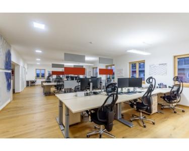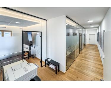 - zwei separate Büroräume an der Stirnseite (Besprechungsraum und Chefbüro)