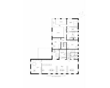 Angrenzend befinden sich die Geschäftsräume mit funktional ausgestatteten Büros und einer Fläche von ca. 373 m². Die untere Etage des Bürotrakts verfügt über ein Großraumbüro mit direktem Zugang zur Doppelgarage, einen Technikraum sowie zwei Lagerräume. Durch das Treppenhaus gelangt man in das obere Geschoss. Hier finden sich neben einem weiteren Großraumbüro die Teeküche, der Serverraum, ein Besprechungszimmer, das Chefbüro sowie die Toiletten. Es ist möglich, hier sein eigenes Gewerbe unterzubringen oder ggfs. zu vermieten.