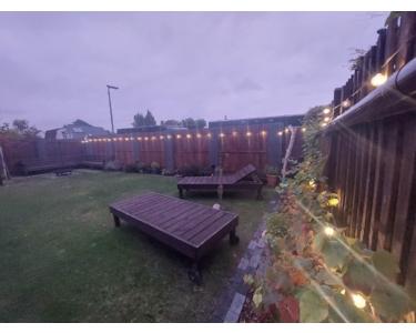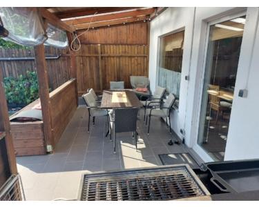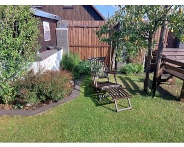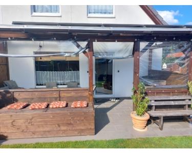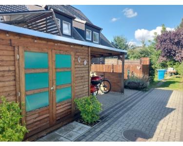 Die überdachte und wettergeschützte 21-m²-Terrasse (Holzbalken 2018 erneuert) erweitert den Wohnraum nach draußen. Eine schön angelegte Feuerecke mit massiver Eckbank bietet Platz für gemütliche Abende mit Freunden und Familie. Der neue, geräumige Schuppen sorgt für Ordnung und Struktur, der große Unterstand schützt Fahrräder und Roller. Eine 11.000-Liter-Regenwasserzisterne ermöglicht kostenlose Gartenbewässerung. Für Planschbecken oder Gartendusche steht außerdem ein Garten-Frischwasseranschluss bereit. Die Müllanlage wurde 2025 blickdicht und optisch ansprechend eingefasst und fügt sich harmonisch ins Gesamtbild ein.