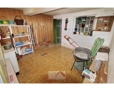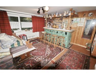 Die Räume im Untergeschoss (kleiner Hobbyraum, Waschkeller, Bad, Partyraum und Werkraum) sind Nutzfläche und nicht in die Wohnfläche eingerechnet. Die Wandfliesen des Badezimmers (mit weißen Sanitärelementen: Badewanne, Toilette und Handwaschbecken) entsprechen dem Baujahr des Hauses.
