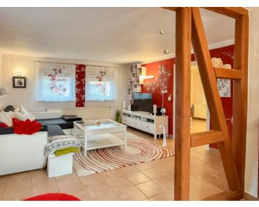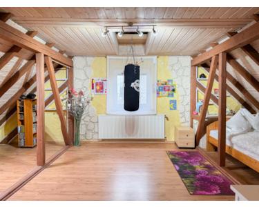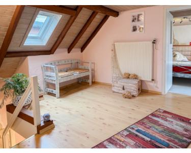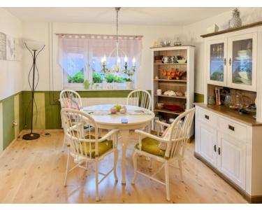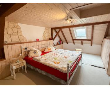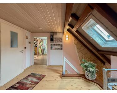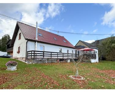 Dieses charmante Einfamilienhaus aus ca. 1914 befindet sich in herrlicher Höhenlage auf einem großzügigen Grundstück von rund 1.219 m², das sich bei Bedarf auch in einen separaten Bauplatz aufteilen ließe. Das Haus präsentiert sich gepflegt und bietet eine Wohnfläche von etwa 132,41 m², die sich über Erd- und Dachgeschoss erstreckt. Im Erdgeschoss empfängt Sie ein großer Wohnbereich mit Kaminofen, von dem aus Sie sowohl den Balkon als auch den Garten erreichen. Das Esszimmer liegt direkt neben der Küche, welche ebenfalls über einen Zugang zum Balkon verfügt. Ein helles Tageslichtbad mit Wanne und Dusche sowie ein weiteres Zimmer, vervollständigen diese Ebene. Die Raumaufteilung ermöglicht komfortables Wohnen auf einer Ebene und eignet sich damit auch hervorragend für das Wohnen im Alter. Im Dachgeschoss stehen zwei Schlafzimmer und ein kleiner Raum, der sich als Büro oder Abstellfläche eignet, zur Verfügung. Der Spitzboden bietet zusätzlichen Stauraum. Eine Einzelgarage mit elektrischem Tor sowie ein Kriechkellerraum sind ebenfalls vorhanden. Das gepflegte Grundstück mit Baumbestand, Gartenhäuschen und beeindruckendem Fernblick macht dieses Zuhause besonders attraktiv. Der Ort selbst besitzt eine eigene Kindertagesstätte und eine Grundschule – ideal für Familien.