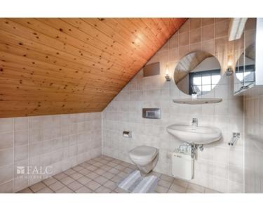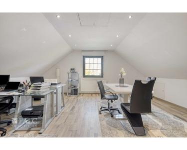 Im Obergeschoss setzt sich das harmonische Wohnkonzept fort. Hier finden Kinder, Gäste oder Homeoffice-Arbeiter ihren Rückzugsort. Ein helles Kinderzimmer, ein Büro mit Abstellraum und Blick ins Grüne, ein separates WC sowie ein Ankleidezimmer bieten vielfältige Nutzungsmöglichkeiten und machen das Wohnen flexibel und modern.