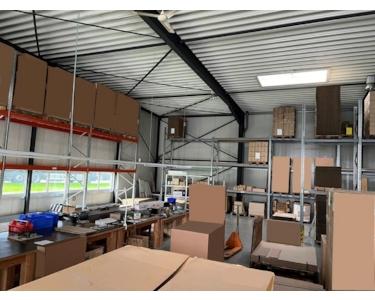 Die Halle ist freitragend, hat einen sehr hochwertigen komplett glatten Boden und 2 Hallentore. Dieser Bereich ist sowohl für eine Fertigung wie für ein sauberes Lager geeignet.