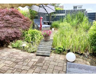 Der Garten bietet außer Platz für Entspannung und gemütliches Beisammensein auch eine Gartenhütte für die Gartengeräte und hat einen Zugang zur Straße.