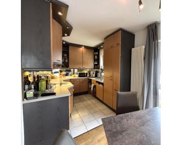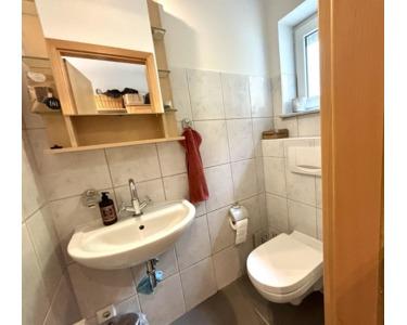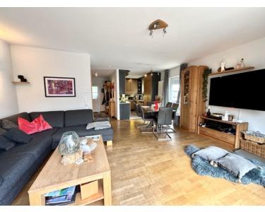 Ein Kaminofen sorgt für eine einladende Atmosphäre und die Einbauküche bietet Platz genug, um gemeinsam zu kochen. Das Gäste-WC rundet das Raumangebot ab.