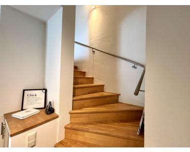 Das Treppenhaus führt vom Wohn-Essbereich in die obere Etage.