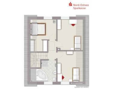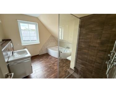 Dachgeschoss: Flur, 3 Zimmer, Tageslichtbad mit Eckbadewanne und bodentiefer Dusche;