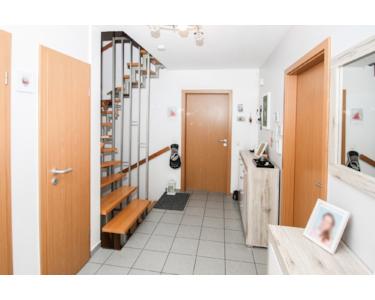 Hier stehen Ihnen familientaugliche 145 m² auf drei Wohnebenen zur Verfügung. In der Eingangsebene finden sich Wohn-/Essbereich, die geräumige Küche und ein Gäste-WC.