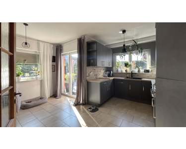Vom offenen Eingangsbereich aus erreicht man den großzügigen, lichtdurchfluteten Küchen- und Essbereich. Von hieraus betritt man die einladende Terrasse mit dem angrenzenden, gepflegten Garten.