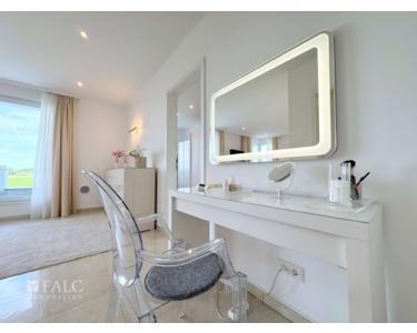 Im Obergeschoss befindet sich das großzügige Hauptschlafzimmer mit direktem Zugang zu einem stilvollen Wellness-Badezimmer sowie einem begehbaren Kleiderschrank – ein exklusiver Rückzugsort mit viel Privatsphäre. Insgesamt verfügt die Hauptwohnung über drei voll ausgestattete Badezimmer und zwei Gäste-WC´s, die den Wohnkomfort zusätzlich unterstreichen.