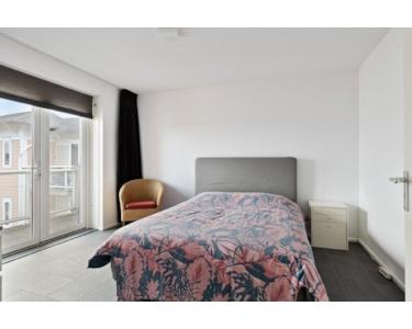 Großes Schlafzimmer (3,5 x 3,8 Meter) mit Doppeltüren zum Balkon mit Blick auf den Parkplatz und die Hellevoetsluis. Ein TV-Anschluss ist ebenfalls vorhanden.