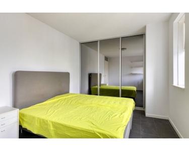 Großzügiges zweites Schlafzimmer, ca. 5 x 3 Meter, mit Kleiderschrank und verspiegelten Schiebetüren. Drei Fenster und ein eigener TV-Anschluss.
