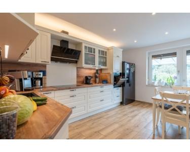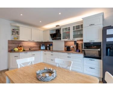 Der Mittelpunkt des Wohnbereichs ist die moderne Einbauküche mit Neff-Einbauherd (2021) und großem Side-by-Side Kühlschrank, direkt angrenzend an den beheizten Wintergarten, der zu jeder Jahreszeit als erweiterter Wohnraum genutzt werden kann.