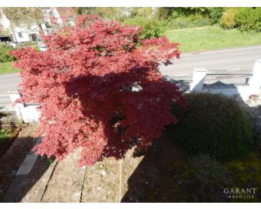 Sträuchern und einem Blutahornbaum vor dem Haus