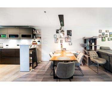 Die moderne Einbauküche ist mit Qualitätsgeräten ausgestattet und fügt sich stilvoll in das Gesamtbild ein. Strapazierfähige, bequeme Vinyl-Bodenbeläge in allen Wohnräumen halten den Familienalltag problemlos aus.