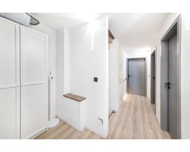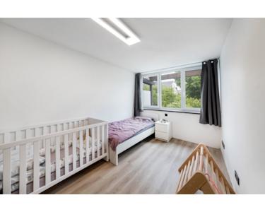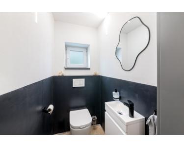 Im Obergeschoss befinden sich zwei gut geschnittene Schlafzimmer sowie ein weiterer Raum, der als Ankleide genutzt wird. Das moderne Tageslichtbad wurde im Zuge der Sanierung vollständig erneuert und bietet zeitloses Design, eine komfortable Walk-In-Dusche sowie zwei Waschbecken. Zusätzlich steht im Erdgeschoss ein Gäste-WC zur Verfügung.