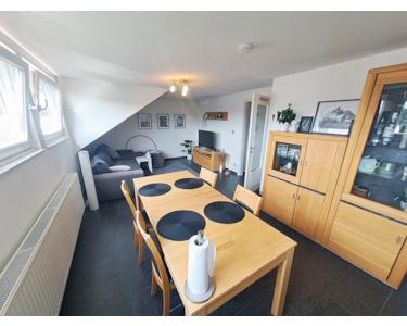 Dachgeschoss (ca. 60 m²): Wohn- und Esszimmer mit Küchenzeile, Elternschlafzimmer, Kinderzimmer (respektive Büro), Diele, Bad