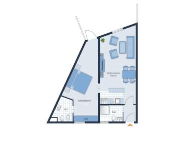 Der offene Wohn- und Küchenbereich bildet das Herzstück und gleichzeitig das Entree der Wohnung. Hier verschmelzen Funktionalität und Gemütlichkeit zu einem harmonischen Ganzen. Die moderne Einbauküche ist offen gestaltet und wird durch einen praktischen Tresen mit Sitzmöglichkeiten ergänzt - perfekt für ein entspanntes Frühstück oder das Glas Wein am Abend. Die geschmackvolle Möblierung, die bereits im Angebotspreis enthalten ist, rundet das Gesamtbild ab und ermöglicht einen sofortigen Einzug ohne zusätzlichen Aufwand.