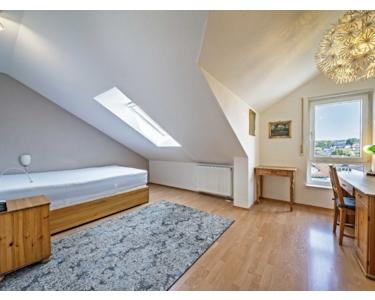 Das Dachgeschoss beheimatet drei Schlafräume, einen Wirtschaftsraum mit Zugang zu einem überdachten Balkon und ein gepflegtes Bad mit Wanne und Dusche.