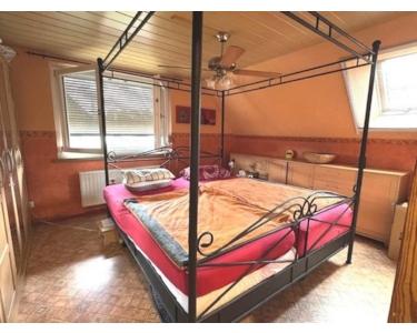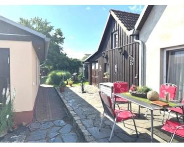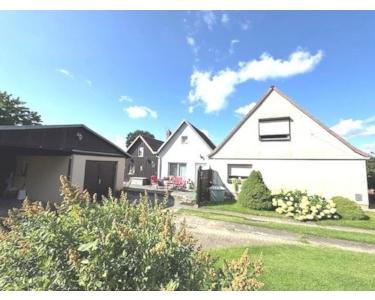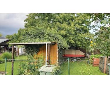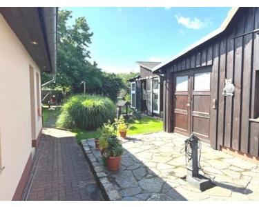 Vor dem Haus empfängt Sie eine imposante Terrasse aus Natursteinen, unter der zwei 1000 L Tanks zum Auffangen von Regenwasser unterirdisch platziert wurden. Das Haus hat 2 Etagen, im Erdgeschoss befinden sich zwei Wohnräume, Dusch- und Wannenbad, Küche mit Einbauküche, Essbereich und angegliedertem hohen Vorratskeller mit Gasbrennwerttherme. Im Obergeschoss steht Ihnen ein weiterer Wohnraum, sowie ein kleines Bad zur Verfügung. Der Bereich davor diente bisher als Arbeitszimmer. Ein großes Carport und die Garage, die z.Z. als Hobbyraum genutzt wird und die Brunnenpumpe zur kostengünstigen Gartenbewässerung beherbergt, stehen in zentraler Lage. Ein kleiner Fischteich, umrandet von Schilfgräsern und Stauden, befinden sich vor dem Gartenhäuschen im ästhetischen Stil. Im weiteren Verlauf des Grundstücks ist eine Feuerstelle gelegen und dahinter steht ein efeubewachsener Bauwagen, der Gartengeräte und sämtliche benötigte Utensilien zur Gartenpflege bereithält. Hier gliedert sich eine teilweise überdachte Gartenfläche an für den Anbau von z.B. Tomaten und Zucchini, denn diese mögen keinen Regen. Um die große Rasenfläche kümmert sich Roland, der Rasenroboter. An der linken hinteren Grundstücksgrenze steht ein Holzgebäude mit Werkstatt und rechts sind Kompostbehälter aufgebaut, um organische Abfälle in nährstoffreichen Humus umzuwandeln, der den Boden verbessert und die Abfallmenge reduziert. Des weiteren gibt es hier ein Tor auf einen öffentlichen Weg, der zu einer Pferdekoppel führt und zum spazieren gehen einlädt.