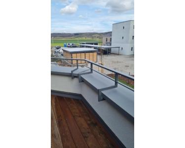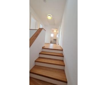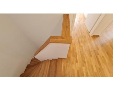 Im Eingangsbereich, im Technikraum und in der Küche sowie in den Bädern sind graue Bodenfließen verlegt. In allen anderen Räumen ist ein hochwertiges Eiche Parkett bzw. bei der Treppe massive Eichenstufen verlegt.