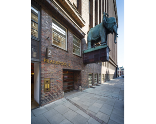 Sehr aufwändig sanierter, äußerst repräsentativer Neubau hinter klassischer Fassade in historischer Form und Materialwelt mit diversen Figuren an der Fassade. Das vorhandene Ziegelmauerwerk wurde nach technischen und optischen Erfordernissen saniert und gereinigt.