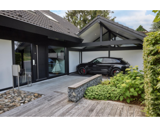 Das Gebäude begrüßt sie stilvoll und leicht verschlossen mit einer großen Einfahrt, vielen Stellplätzen sowie einer großen Doppelgarage und einem Carport.